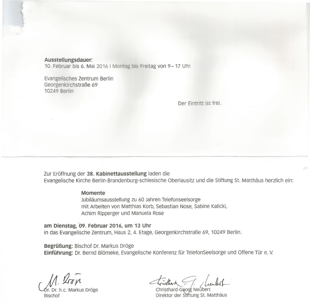 Die Ausstellung umfasst fünf Bilder und eine Figur, die die Arbeit der Telefonseelsorge charakterisiert. Die Ausstellung war bisher an über 30 Orten zu sehen. Zur Ausstellung ist eine Begleitmappe erschienen mit einer Einführung in die Ausstellung, mit Abbildungen der Exponate und den geistlichen Betrachtungen. Zu jedem Bild hat eine geistliche Autorin, ein geistlicher Autor eine Betrachtung verfasst.